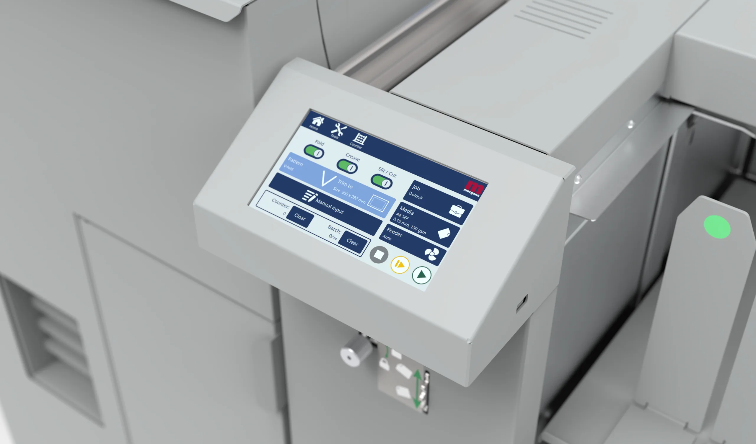 Uma tela sensível ao toque colorida e intuitiva com tela de execução que oferece uma visão geral completa do trabalho em andamento. Ajustes básicos podem ser feitos “em tempo real” e o acesso aos padrões de vinco e dobra é simples. A interface do usuário está disponível em vários idiomas. Com as novas “Configurações automáticas”, esta função verdadeiramente única cuida das configurações de folga dos rolos, do ajuste de velocidade e das configurações do ventilador, eliminando ajustes demorados de várias configurações.